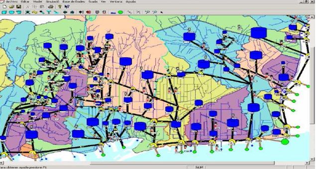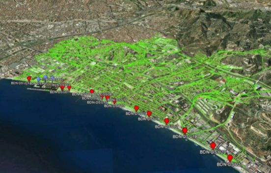 圖9. 巴達(dá)洛納排水管(綠色)、水廠(藍(lán)色)、溢流(紅色)網(wǎng)示意圖