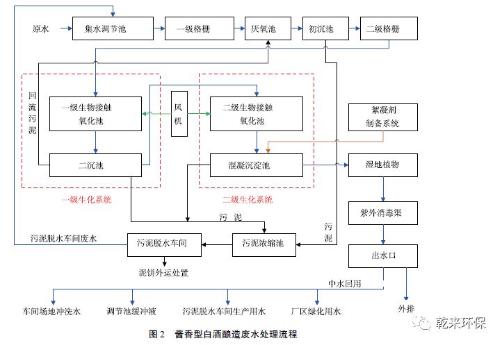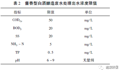 經(jīng)過比選各類工藝,根據(jù)醬香型白酒釀造的獨(dú)特工藝以及釀造過程中廢水排放的特點(diǎn)和性質(zhì),選取“物理化學(xué)垣兩級生化處理系統(tǒng)”工藝對醬香型白酒釀酒廢水進(jìn)行處理,處理水最終經(jīng)濕地植物凈化后排入外環(huán)境,部分回用于釀造車間場地沖洗水、廢水處理污泥脫水車間沖洗水、集水井緩沖液以及廠區(qū)綠化用水,水質(zhì)能夠滿足GB 27631—2011《發(fā)酵酒精和白酒工業(yè)水污染物排放標(biāo)準(zhǔn)》中表3 規(guī)定的排放標(biāo)準(zhǔn)。