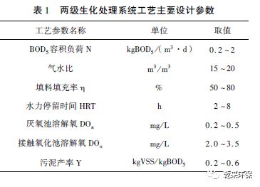 2. 3 兩級生化系統(tǒng):一級生化系統(tǒng)承擔(dān)較重的處理任務(wù),該單元將使廢水中有機(jī)污染物削減大約70,該單元生物接觸氧化池內(nèi)微生物處于對數(shù)增長期及減速增長期前段,生物膜狀態(tài)極佳,對有機(jī)物的降解速率較高;二級生化系統(tǒng)生物接觸氧化池內(nèi)微生物處于微生物減速增長期后段或生物膜穩(wěn)定期,生物相較穩(wěn)定,處理水質(zhì)在這一單元得到進(jìn)一步的提高。每級生化系統(tǒng)均有一個(gè)厭氧池、一個(gè)生物接觸氧化池及一個(gè)沉淀池組合而成。廢水進(jìn)入?yún)捬醭睾螅瑥?fù)雜有機(jī)污染物經(jīng)厭氧菌及兼性厭氧菌作用氨化,轉(zhuǎn)化為簡單的化合物及氨態(tài)氮。同時(shí),聚磷菌完成釋磷過程,將細(xì)胞內(nèi)聚磷水解為正磷酸鹽,并降解水中部分有機(jī)物;生物接觸氧化池通過附著在池內(nèi)填料上的微生物的吸附劑分解作用,將廢水中污染物去除,釋磷菌在好氧條件下進(jìn)行聚磷反應(yīng),從污水中攝取磷酸鹽,菌膠團(tuán)與脫落的生物膜以及截留的懸浮物質(zhì)一起,隨水流進(jìn)入沉淀池,污染物通過剩余污泥的排放得以去除。此外,在生物接觸氧化池中可加入少量FeS粉末,起調(diào)節(jié)電位、絮凝及除磷的作用。工藝主要設(shè)計(jì)參數(shù)如表1 所示。
