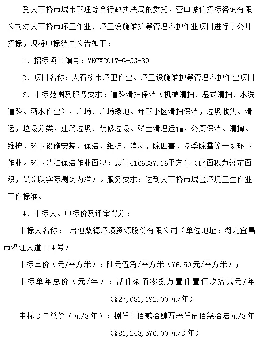 0.81億元中標(biāo)大石橋市環(huán)衛(wèi)作業(yè)、環(huán)衛(wèi)設(shè)施維護(hù)等管理養(yǎng)護(hù)作業(yè)項(xiàng)目