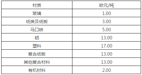 企業(yè)想要加入雙軌系統(tǒng),就必須交納“綠點”商標的使用許可費。許可費主要用于支付DSD的管理成本、收運及分類成本、公眾教育成本、廣告成本。費用的多少是按照包裝材料的類型和重量計算的,計算時將包裝材料分為8類,分別為玻璃、紙類及紙板、馬口鐵、鋁、塑料、復合紙板(紙質(zhì)飲料包裝)、其他復合材料、有機材料。在計算費用時,首先將包裝分解成這八種組成部分,然后根據(jù)每個包裝中含有的材質(zhì)重量、對應材質(zhì)的價格、包裝在市場上的發(fā)放量,來計算加入費用?!栋b條例》在經(jīng)過多次修訂后,不再要求企業(yè)必須在包裝上印刷“綠點”標識,但企業(yè)仍可選擇向DSD支付使用費,在包裝上印刷該標識。