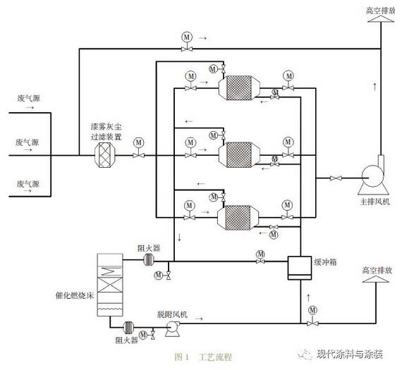 此次處理廢氣有風(fēng)量大、有機(jī)物濃度低、含一定粘性漆霧及顆粒粉塵等特點(diǎn)。結(jié)合同行業(yè)中的成功實(shí)踐經(jīng)驗(yàn),采用“組合式過濾器+活性炭吸附+脫附催化燃燒再生”工藝來治理有機(jī)廢氣,此工藝是利用催化燃燒反應(yīng)熱能脫附吸附在活性炭內(nèi)有機(jī)溶劑[3]。