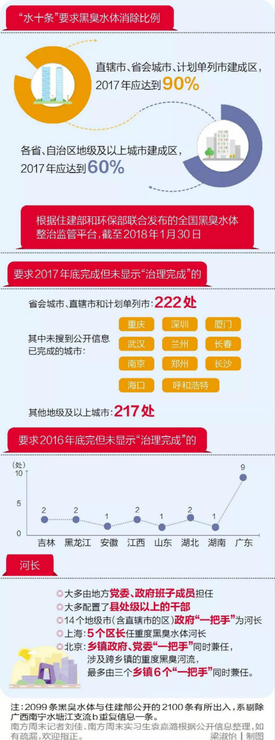 小龍河從黑臭水體的名單上“銷(xiāo)號(hào)”了。但全國(guó)的黑臭水治理狀況卻不容樂(lè)觀:據(jù)南方周末記者統(tǒng)計(jì),在監(jiān)管平臺(tái)上,截至2018年1月30日,全國(guó)要求在2017年消除的黑臭水中,顯示“尚在治理中”的有789個(gè),“方案制定中”的有190個(gè),未完成率接近一半。
