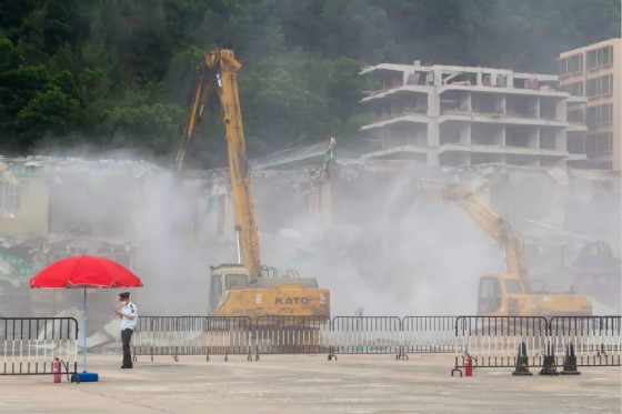 2017年7月26日,廣州舉行河涌違建專(zhuān)項(xiàng)整治現(xiàn)場(chǎng)觀摩會(huì),聯(lián)合工作人員對(duì)違章建筑進(jìn)行拆除。陳志剛 | 南方都市報(bào) | 視覺(jué)中國(guó)