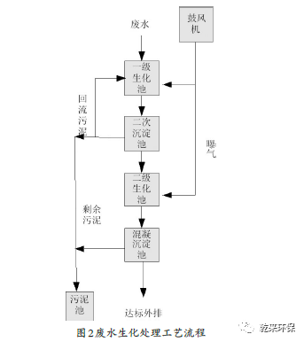 由圖2可知:通過鼓風(fēng)機(jī)曝氣和生物膜的處理方法進(jìn)行二次生化處理,將經(jīng)過處理后的廢水通過污水提升泵輸送到一級(jí)的生化池中,該氣浮在進(jìn)水之前,需要進(jìn)行二次沉淀,與回流的污泥充分的接觸,進(jìn)而形成活性的污泥。污泥與污水混合后,再從曝氣的鼓風(fēng)機(jī)中獲取足夠的氧(必須是溶解氧),進(jìn)行硝化反應(yīng),使混合液中的可溶性有機(jī)物被具有活性的污泥吸附,從而達(dá)到微生物降解的目的,此時(shí)的化學(xué)需氧量(COD)已經(jīng)被去除75%。