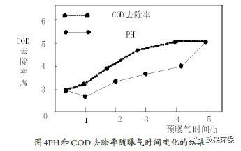 (二)預(yù)曝氣與COD去除的結(jié)果與分析:根據(jù)上述參數(shù)的設(shè)定,對(duì)預(yù)曝氣環(huán)節(jié)進(jìn)行測定,其PH和COD去除率會(huì)隨著曝氣時(shí)間的推移而發(fā)生改變,結(jié)果如圖4所示。