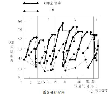 通過適量的預(yù)曝氣,能夠去除廢水中的污染物,從而提升PH值。適當(dāng)?shù)目刂茀?shù)有助于難生物降解的COD轉(zhuǎn)化為易生物降解的COD,為了提高在這四個(gè)階段的COD去除效果,可以將第二階段的運(yùn)行時(shí)間加長,如圖5所示。