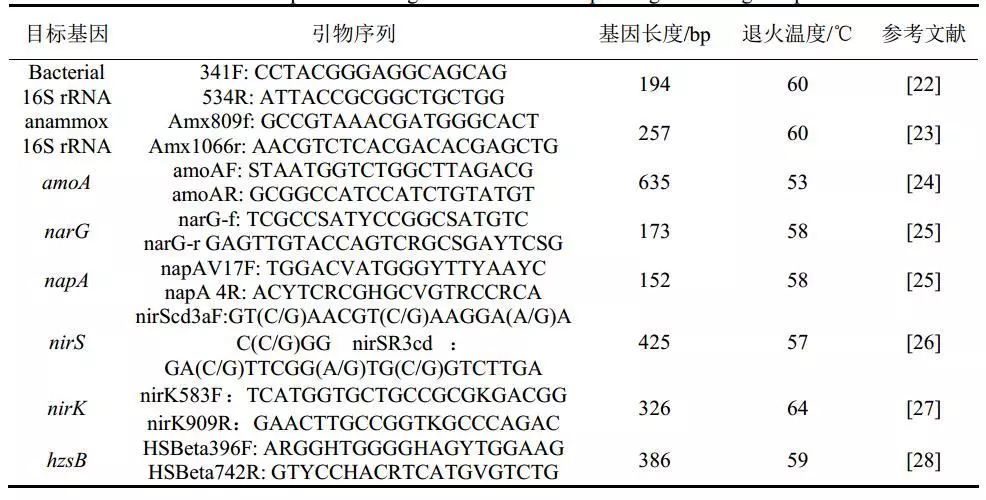 污泥樣品采用FastDNA SPIN Kit for soil試劑盒提取污泥DNA,而后用NanoDrop 2000超微量紫外分光光度計(jì)定量,采用SYBR® Green染料法進(jìn)行定量PCR分析。選取目標(biāo)基因包括:細(xì)菌16S rRNA基因、厭氧氨氧化菌16S rRNA基因及部分氮素轉(zhuǎn)化功能基因,以含有目標(biāo)基因的質(zhì)粒標(biāo)準(zhǔn)品建立標(biāo)準(zhǔn)曲線(R2 > 0.999)。擴(kuò)增體系為25 μL,含12.5 μL 2 × SYBR® Green PCR Master Mix(Vazyme,中國(guó)),2 μL模板DNA(20 ng/μL),正反引物各0.2 μL,10.1 μL無(wú)菌超純水;擴(kuò)增程序在熒光定量PCR儀AB7500(Life Technologies, 美國(guó))進(jìn)行,每個(gè)樣品做三個(gè)平行,具體參數(shù)如表1所示。
