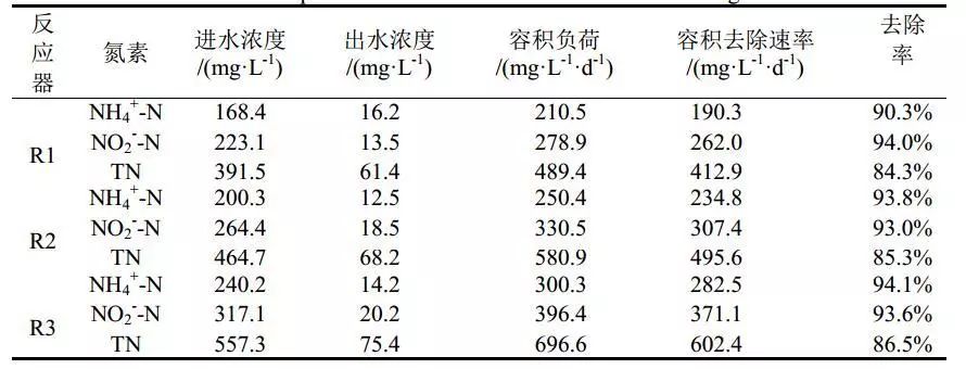 在厭氧氨養(yǎng)護(hù)污泥富集培養(yǎng)中,由于厭氧氨氧化菌生長(zhǎng)緩慢,反應(yīng)器容積負(fù)荷有限。許多研究證明了高氮素基質(zhì)對(duì)厭氧氨氧化菌的抑制作用。Strous等研究表明亞硝酸鹽濃度達(dá)到100 mg/L,即可強(qiáng)烈抑制厭氧氨氧化菌活性;本研究以出水亞硝酸鹽濃度高于100 mg/L作為反應(yīng)器超過(guò)可承受負(fù)荷并失穩(wěn)的依據(jù)。對(duì)照組R1在運(yùn)行90 d時(shí),容積氮負(fù)荷超出反應(yīng)器承受極限,出水NH4+-N和NO2--N濃度急劇升高,類似失穩(wěn)現(xiàn)象也出現(xiàn)在試驗(yàn)組R2(第102 d)、R3(第114 d)。反應(yīng)器失穩(wěn)后,降低進(jìn)水基質(zhì)氮濃度,同時(shí)加大回流比以解除基質(zhì)自抑制;由于EGSB反應(yīng)器抗沖擊負(fù)荷能力強(qiáng),反應(yīng)器很快恢復(fù)穩(wěn)定運(yùn)行。穩(wěn)定階段反應(yīng)器運(yùn)行狀況如表2所示。Chen等通過(guò)批次試驗(yàn)證明了3.68 mg/L的鐵離子添加下,比厭氧氨氧化活性可提高533.2%;長(zhǎng)期試驗(yàn)證明,鐵離子的添加,相較于控制組,提升了19.5%的反應(yīng)器容積負(fù)荷,與本研究結(jié)果類似。