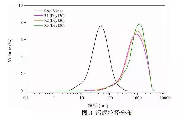 從反應(yīng)器中取一定量污泥至50 mL離心管中,置于激光粒度儀(Mastersizer 3000,英國(guó)馬爾文儀器有限公司)中檢測(cè)。樣品充分混勻后,以水為分散劑進(jìn)行分析測(cè)試,并使用機(jī)器配置的軟件進(jìn)行記錄,使用一次性塑料滴灌吸取攪拌均勻的樣品,污泥樣加至遮光度在10%~15%時(shí)進(jìn)行測(cè)試。單一樣品重復(fù)測(cè)定三次,以降低誤差。