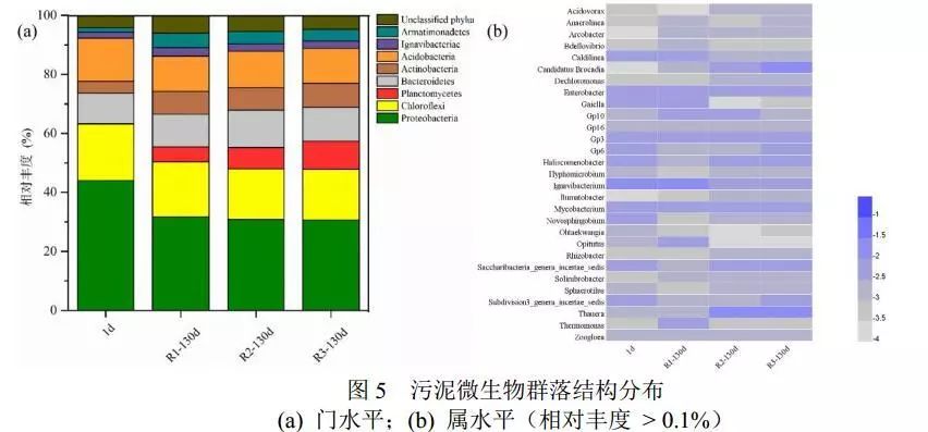 圖5(b)為污泥微生物屬水平熱圖??梢钥闯觯瑓捬醢毖趸鶦andidate Brocadia明顯富集;接種污泥中Candidate Brocadia菌難以檢測(cè)其豐度(< 0.01%),經(jīng)130 d的富集培養(yǎng),對(duì)照組R1污泥樣品中厭氧氨氧化菌Candidate Brocadia相對(duì)豐度為4.2%,而試驗(yàn)組R2、R3污泥樣品中其豐度分別為6.8%、8.2%,高于對(duì)照組R1。