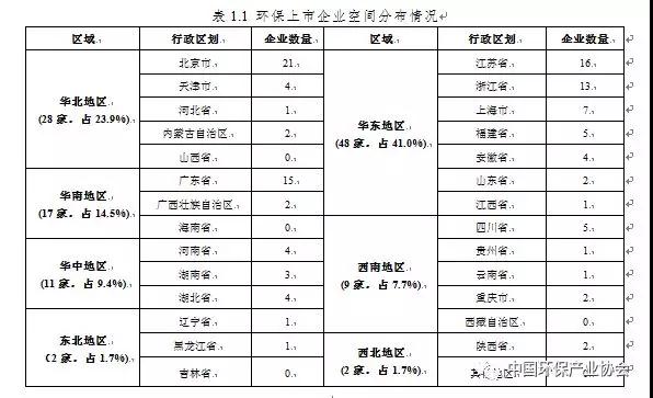 從環(huán)保上市企業(yè)的地理分布看,大部分環(huán)保上市企業(yè)集中在北京市及華東、華南地區(qū),特別是東南沿海省份(如廣東省、浙江省、江蘇省等),而東北、西北地區(qū)部分省市的環(huán)保上市企業(yè)分布較少。這與中國各省的經(jīng)濟(jì)發(fā)展?fàn)顩r、城鎮(zhèn)化水平、人口密度等的分布情況較為一致。北京市以及東南沿海省份憑借其地緣優(yōu)勢、較為充沛的資本量、人才薈萃等有利因素,形成了可觀的行業(yè)市場,集聚了大部分環(huán)保上市企業(yè);東北地區(qū)作為經(jīng)濟(jì)嚴(yán)重下滑的老工業(yè)區(qū),西北地區(qū)經(jīng)濟(jì)欠發(fā)達(dá)、人口密度稀薄,大型環(huán)保上市企業(yè)分布稀少,但隨著“一帶一路”建設(shè)的深入推進(jìn),未來西北地區(qū)環(huán)保產(chǎn)業(yè)或?qū)⒌玫介L足發(fā)展(見表1.1)。