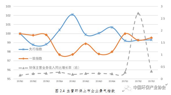一致指數(shù)顯示,相較景氣波動(dòng)下滑的2016年,2017年A股環(huán)保上市企業(yè)景氣表現(xiàn)呈現(xiàn)持續(xù)上升態(tài)勢,3季度一致指數(shù)數(shù)值為99.05,高于2016年同期的98.29。主營環(huán)保上市企業(yè)2017年總體景氣表現(xiàn)優(yōu)于2016年,且呈現(xiàn)上升態(tài)勢,3季度數(shù)值一致指數(shù)數(shù)值達(dá)99.53,較上年同期上升了1.79,且略高于同期A股環(huán)保上市企業(yè)(見圖2.3、圖2.4)。