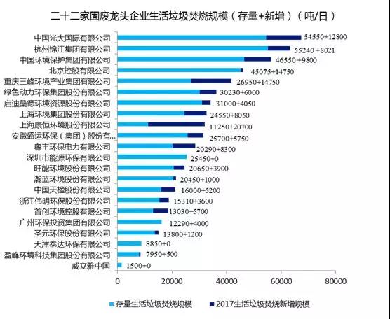 圖 二十二家固廢龍頭企業(yè)生活垃圾焚燒規(guī)模(存量+新增)(噸/日)