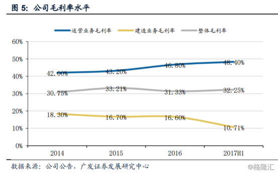 另外一個就是財務準則的改變。在中國內陸的財務準則下,建設收益是不計入營收的,所以更改后2016年的營收與凈利潤分別下降約約65%和35%,但是公司基本面不變。由于建設收入不計入收入,而建設業(yè)務的毛利率較運營業(yè)務低,拉低了公司整體毛利率水平,調整后公司的毛利率將由32%上升至64.9%。