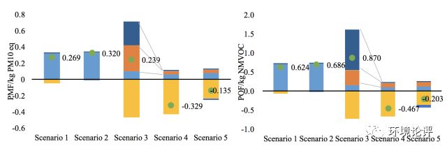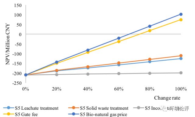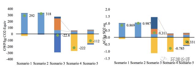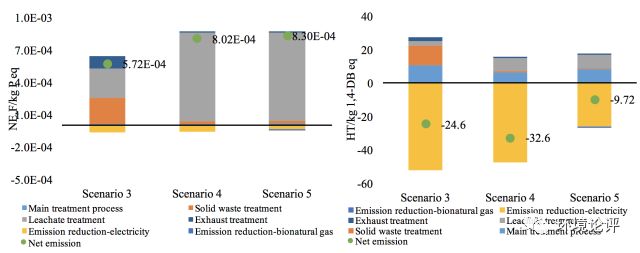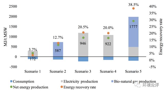 注:情景1-填埋+填埋氣發(fā)電;情景2-填埋+填埋氣提純;情景3-焚燒發(fā)電;情景4-機械生物處理+沼氣發(fā)電;情景5-機械生物處理+沼氣提純。下同。