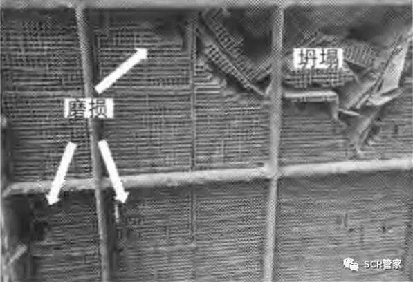 高溫?zé)煔鈹y帶大量顆粒物進(jìn)入SCR反應(yīng)器與催化劑發(fā)生碰撞,在“馬格努斯效應(yīng)”下將使催化劑壁厚逐漸減小而造成磨損,甚至導(dǎo)致催化劑的坍塌,如圖1所示。催化劑磨損與流場(chǎng)分、煙氣特性、飛灰特性等因素有關(guān)。
