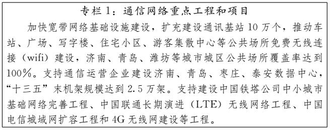 ?。ㄒ唬?qiáng)化項(xiàng)目帶動(dòng),提升產(chǎn)業(yè)規(guī)模組織實(shí)施重大基礎(chǔ)設(shè)施項(xiàng)目。積極推進(jìn)山東半島自主創(chuàng)新示范區(qū)、黃河三角洲國家農(nóng)業(yè)高新技術(shù)產(chǎn)業(yè)示范區(qū)建設(shè)。完善高技術(shù)產(chǎn)業(yè)基地、戰(zhàn)略性新興產(chǎn)業(yè)示范基地的基礎(chǔ)設(shè)施,提高產(chǎn)業(yè)承載能力。規(guī)劃建設(shè)山東省藍(lán)谷區(qū)域創(chuàng)新中心等一批省級(jí)區(qū)域創(chuàng)新中心,推進(jìn)區(qū)域創(chuàng)新資源的開放共享,打造形成特色優(yōu)勢(shì)顯著的“創(chuàng)新谷”。落實(shí)智慧城市、寬帶山東、大數(shù)據(jù)等重大戰(zhàn)略,推進(jìn)新一代網(wǎng)絡(luò)通訊、大數(shù)據(jù)中心等基礎(chǔ)設(shè)施建設(shè),提升支撐能力。