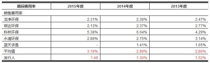 根據(jù)招股書,發(fā)行人2013、2014、2015年度前五大客戶銷售收入占當(dāng)期營業(yè)收入的比例分別為46.98%、54.33%、65.14%,呈逐年上升趨勢。同時(shí),發(fā)行人相同期間的銷售費(fèi)用分別為242.38萬元、278.80萬元、346.81萬元,對(duì)應(yīng)的銷售費(fèi)用率分別為1.52%、1.30%、1.48%。與同行業(yè)上市公司龍凈環(huán)保、菲達(dá)環(huán)保、科林環(huán)保、永清環(huán)保、藍(lán)天求是等對(duì)比,發(fā)行人的銷售費(fèi)用率處于明顯偏低水平,因此被懷疑調(diào)節(jié)銷售費(fèi)用。