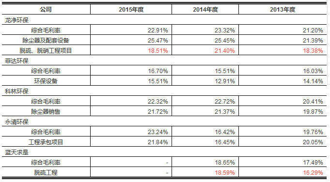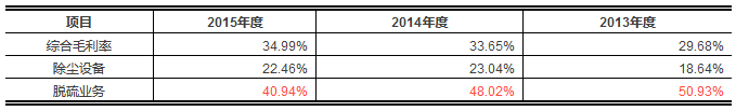根據(jù)招股書,2013、2014、2015年度發(fā)行人除塵設(shè)備、脫硫業(yè)務(wù)的毛利率如下: