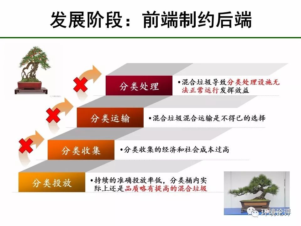 我國2000年開始在8個(gè)試點(diǎn)城市開始推行垃圾分類,總體而言進(jìn)展緩慢,收效甚微,飽受社會(huì)質(zhì)疑與批評,其中一個(gè)主要原因就是尚未建成現(xiàn)代化、多樣化的垃圾處理設(shè)施,即使居民做到了源頭分類,環(huán)衛(wèi)企業(yè)也做不到分類收集和分類運(yùn)輸,最終只能“殊途同歸”,進(jìn)入垃圾填埋場。部分小區(qū)采取各種激勵(lì)和監(jiān)督措施后形成的一些示范案例,盡管在營造氛圍、培養(yǎng)習(xí)慣和方便拾荒者方面有一定意義,但歸根到底只是一些點(diǎn)綴性的盆景,尚未形成園林,遑論森林。這一階段是垃圾分類的起步階段,其基本特點(diǎn)是“后端決定前端”,即后端分類處理設(shè)施的缺乏,決定了前端分類收集徒具形式,“混收混運(yùn)”廣受詬病,但客觀上難以避免。