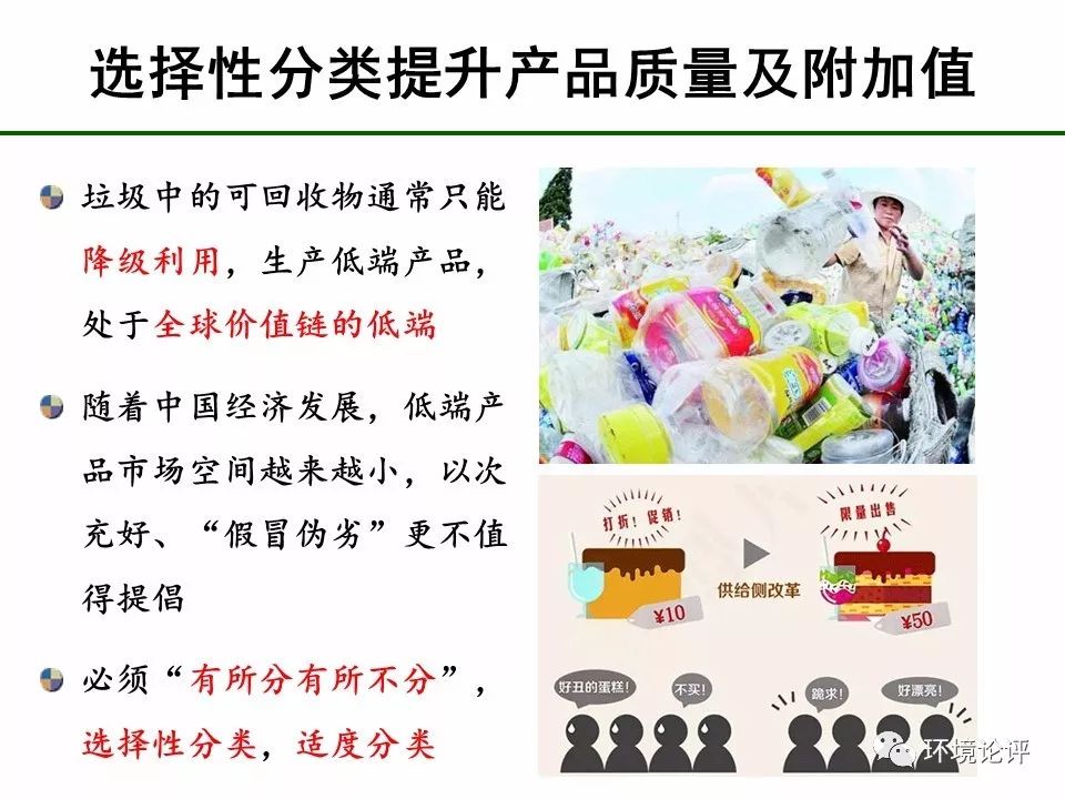 我國當(dāng)前大力推行的供給側(cè)結(jié)構(gòu)性改革實(shí)際上大大提升了垃圾分類產(chǎn)物回收利用的準(zhǔn)入門檻,常態(tài)化的嚴(yán)格環(huán)保督查與“洋垃圾”入境禁令又大大壓縮了“散、亂、污”再生資源回收企業(yè)的生存與發(fā)展空間,“高質(zhì)量發(fā)展”也意味著過去量大質(zhì)次、薄利多銷的低端再生產(chǎn)品將逐步退出歷史舞臺(tái)。可以預(yù)期,短時(shí)間之內(nèi)我國生活垃圾源頭分類的準(zhǔn)確性不可能很高,現(xiàn)階段追求“量大”,其后果往往是一堆垃圾勉強(qiáng)分成組分略有差異的幾堆垃圾,以其為原料只能生產(chǎn)大量低端再生產(chǎn)品,而且要付出較高的經(jīng)濟(jì)成本或環(huán)境代價(jià)。低端再生產(chǎn)品市場空間越來越小,反過來又對垃圾源頭分類造成沖擊。因此,現(xiàn)階段推行垃圾分類,應(yīng)著眼于居民分類習(xí)慣的真正養(yǎng)成與生態(tài)環(huán)境質(zhì)量的整體改善,采取選擇性分類策略,更加注重分出產(chǎn)物的“質(zhì)精”而非“量大”。有了“質(zhì)精”的分類產(chǎn)物,才可能有高質(zhì)量的再生產(chǎn)品,才能有效切斷“散、亂、污”企業(yè)的原料供給,促進(jìn)再生資源回收行業(yè)轉(zhuǎn)型升級(jí),實(shí)現(xiàn)“高質(zhì)量發(fā)展”。