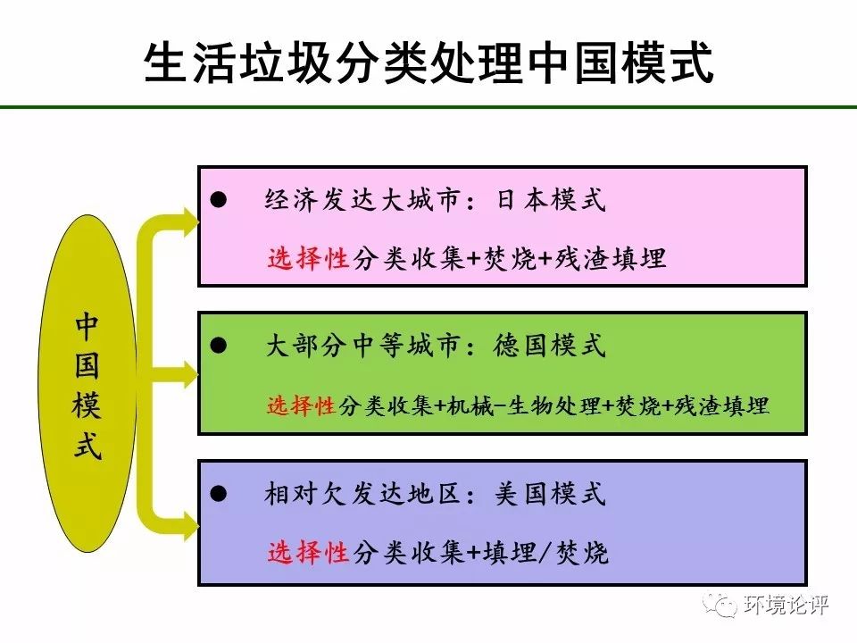 我國經(jīng)濟(jì)社會(huì)發(fā)展不平衡的問題還十分突出,不同區(qū)域自然條件也存在巨大差異,這就決定了我國生活垃圾分類處理必須對癥下藥,因地制宜。在選擇性分類收集,即將垃圾中特別有用、特別有害、特別有干擾的組分在源頭分出來的基礎(chǔ)上,土地稀缺、人口密集、經(jīng)濟(jì)發(fā)達(dá)的大城市可以采取焚燒發(fā)電為主的處理方式,土地相對豐富、人口較為稀疏、經(jīng)濟(jì)相對欠發(fā)達(dá)的地區(qū)可以采取填埋為主焚燒為輔的處理方式,大部分中等城市可以采用焚燒發(fā)電與生物處理相結(jié)合的處理方式。也就是說,生活垃圾分類處理中國模式不可能是單一模式,而是博采日本、美國、德國之所長的綜合模式。