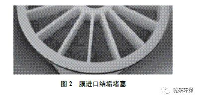 為減少蒸發(fā)量,部分廠家采用RO 膜技術(shù)進(jìn)行濃縮。煤化工廢水TDS濃度約為3 000 mg ˙ L-1,硬度約為300 mg ˙ L-1,COD 約為300 mg ˙L-1。在高濃縮比的工況下,長(zhǎng)時(shí)間運(yùn)行會(huì)對(duì)膜進(jìn)口和膜面產(chǎn)生污染。因此需投加藥劑除硬,增加了污泥外置費(fèi)用。卷式RO 膜無(wú)法進(jìn)一步提高濃縮比的主要原因有兩個(gè):第一是卷式RO 膜的進(jìn)入通道較窄,第二是其膜面剪切力不足。RO 膜進(jìn)口結(jié)垢堵塞情況見圖2。