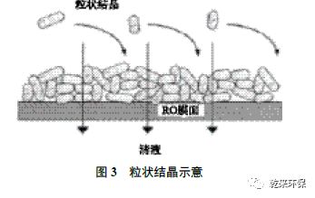 3.2膜面結(jié)晶:膜面結(jié)晶是RO 膜應(yīng)用的重要議題。按結(jié)晶理論,結(jié)晶狀態(tài)通??煞譃榱罱Y(jié)晶和膜面結(jié)晶。當(dāng)溶液達(dá)到溶解度極限范圍時(shí),分子相互碰撞產(chǎn)生晶體,晶體是不溶解的粒狀固體,隨水流方向壓到膜面上。粒狀晶體堆在膜面上比較松散,或隨著水流沖到濃液出口,因此粒狀結(jié)晶不會(huì)對(duì)膜通量帶來太大影響。粒狀結(jié)晶見圖3。