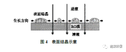 膜面結(jié)晶是鹽水在通過膜面時(shí)進(jìn)行脫鹽,水被壓過膜產(chǎn)生清液,膜面瞬時(shí)在高鹽濃度下結(jié)晶(見圖4)。