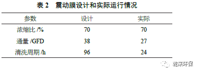 這兩項(xiàng)設(shè)計(jì)可以使廢水在不除硬的前提下進(jìn)行濃縮。按現(xiàn)有的實(shí)踐經(jīng)驗(yàn),震動(dòng)膜濃液TDS 濃度可達(dá)100 000 μg/g。濃縮比可以達(dá)到90%,即可減少蒸發(fā)量達(dá)90%。產(chǎn)水TDS 濃度約為100mg ˙ L-1 以下,完全滿足回用要求。