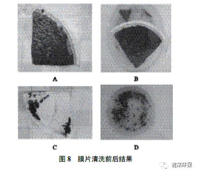 由表1 和表2 可知,震動(dòng)膜產(chǎn)水水質(zhì)滿足回用要求,但膜通量和清洗周期還未達(dá)到設(shè)計(jì)標(biāo)準(zhǔn)。圖8 為膜面在清潔前后的觀察結(jié)果。