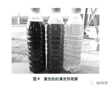 圖8 中A、B 膜片在清洗前發(fā)現(xiàn)有大量膠狀有機(jī)物,通過化學(xué)清洗后可以恢復(fù)潔白(如圖8C 所示),清洗出來的殘余物D 為塊狀物質(zhì)。因而化學(xué)清洗可以令膜再生。但實(shí)際上該膜組的清洗程度并不夠。通過對(duì)該項(xiàng)目正運(yùn)行的膜組連續(xù)進(jìn)行三次化學(xué)清洗,每次對(duì)清洗浸泡液取樣觀察(見圖9)。