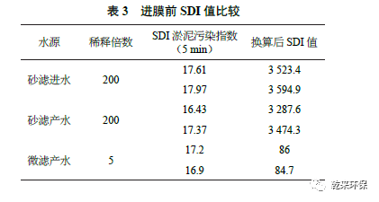 結(jié)果發(fā)現(xiàn),首次清洗后的浸泡液顏色較深,連續(xù)重復(fù)清洗顏色逐次變淡,表明現(xiàn)時(shí)一次清洗未能把污染物完全去除。說明前處理不足,進(jìn)水有機(jī)膠體含量太高。進(jìn)一步使用稀釋調(diào)整后的SDI 法可以對(duì)前處理效果進(jìn)行量化。