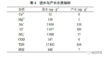 由圖10 可知,微濾處理后,SDI 值由3 500 降至85,整體膜通量和清洗周期得到質(zhì)的改善。采用100 h 作為清洗周期,可滿足原設(shè)計(jì)標(biāo)準(zhǔn)要求。表4 為另一煤化工項(xiàng)目廢水“零排放”震動(dòng)膜膜濃縮案例的進(jìn)水與產(chǎn)水水質(zhì)指標(biāo)。