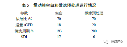 該項(xiàng)目震動(dòng)膜空白和微濾預(yù)處理運(yùn)行情況比較見表5。