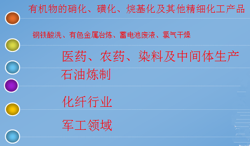 有機化工產品如檸檬酸、氨基磺酸、草酸、硫酸二甲酸、合成甲酚、十二烷基苯磺酸等產品及磺化、硝化、烷基化、酯化等化學反應單元,這些反應廣泛用于農藥、醫(yī)藥、染料、香料等行業(yè)生產,都大量用到硫酸。每年應用于有機化工產品的硫酸在1000-1500萬噸,其中有參與化學反應,同時產生大量20-60%的廢硫酸,保守統(tǒng)計,應該在2000萬噸以上部分。