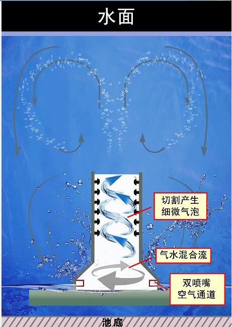 旋流曝氣器在工作過(guò)程中,氣體從底部法蘭口進(jìn)入后從緊貼鐘型曲面的 2 個(gè)噴嘴噴出形成旋流效果,以極快的速度沿著鐘型壁面向上加速回旋。由于鐘型上側(cè)漸漸狹窄,空氣獲得極大的加速度和沖擊力。 由于氣體作用,混合液在筒內(nèi)、外循環(huán)流動(dòng),氣液上升過(guò)程中,被筒內(nèi)部結(jié)構(gòu)多次碰撞切割,形成大量超微氣泡,且與周?chē)哪嗨旌衔锍浞只旌?,增加了氧氣的傳質(zhì)速率和氧利用率;充分混合的氣水猛力向上沖出,強(qiáng)烈的循環(huán)水流使部分小氣泡和水流返回池底,同時(shí)使底部淤泥參與循環(huán),因而整個(gè)曝氣池內(nèi)無(wú)充氧盲區(qū),實(shí)現(xiàn)了曝氣池容積利用最大化。(見(jiàn)圖3)