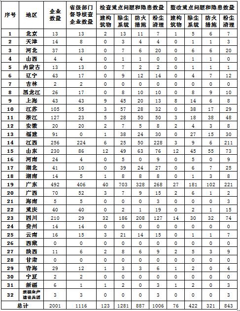 (三)責(zé)任落實(shí)層面,整治部署要求落實(shí)不到位,跟蹤督辦力度不夠,整治工作還沒(méi)有閉環(huán)。一是執(zhí)法檢查不夠嚴(yán)格。一些地區(qū)存在重檢查輕整改、只檢查不執(zhí)法、以隨機(jī)抽查代替集中整治的問(wèn)題。從各地報(bào)送的調(diào)度表看,一些地區(qū)落實(shí)整治要求不到位,取締關(guān)閉、停產(chǎn)整頓的企業(yè)很少,有的地區(qū)甚至限期整改企業(yè)數(shù)為零,此類問(wèn)題在河北、吉林、廣西等省(區(qū))的部分地區(qū)比較突出。二是沒(méi)有按要求調(diào)度通報(bào)工作進(jìn)展。有的地區(qū)沒(méi)有將國(guó)家安全監(jiān)管總局明查暗訪通報(bào)的要求落實(shí)到位,有的地區(qū)一轉(zhuǎn)了之,沒(méi)有“對(duì)號(hào)入座”、舉一反三。部分地區(qū)沒(méi)有按要求定期調(diào)度轄區(qū)工作信息,有的沒(méi)有印發(fā)通報(bào)或僅是“點(diǎn)對(duì)點(diǎn)”通報(bào),有的通報(bào)指出問(wèn)題時(shí)大而化之,不明確、不具體。三是省級(jí)安全監(jiān)管部門對(duì)作業(yè)場(chǎng)所30人及以上企業(yè)的督導(dǎo)核查不到位。經(jīng)統(tǒng)計(jì)匯總各地區(qū)調(diào)度表,全國(guó)共有作業(yè)場(chǎng)所30人及以上金屬粉塵、木粉塵企業(yè)2001家,各省級(jí)安全監(jiān)管部門已經(jīng)組織督導(dǎo)核查的共計(jì)1116家,河北、遼寧、浙江、福建、山東、河南、湖北、湖南、四川、青海、新疆等地區(qū),督導(dǎo)核查的企業(yè)數(shù)量沒(méi)超過(guò)半數(shù)。四是報(bào)送的調(diào)度報(bào)表填寫不規(guī)范、不準(zhǔn)確、不真實(shí)。專項(xiàng)整治的3個(gè)調(diào)度表是體現(xiàn)工作進(jìn)展和不斷深化整治的重要依據(jù),一些地區(qū)基層部門沒(méi)有認(rèn)真填寫,省級(jí)部門沒(méi)有認(rèn)真分析、審核,存在錯(cuò)項(xiàng)漏項(xiàng)或不合邏輯的信息。部分地區(qū)“未完成‘十大重點(diǎn)問(wèn)題和隱患’整改的企業(yè)數(shù)量”占本地區(qū)粉塵涉爆企業(yè)總數(shù)比例過(guò)低、甚至為零,需要認(rèn)真核實(shí)數(shù)據(jù)的準(zhǔn)確性。具體情況見(jiàn)《2017年粉塵防爆專項(xiàng)整治情況匯總表》(附件1)。