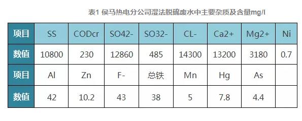 3.4 脫硫廢水:煙氣濕法脫硫過程產(chǎn)生的廢水來源于吸收塔排放水。為維持脫硫裝置將夜循環(huán)系統(tǒng)的物質(zhì)的平衡,需要定時從吸收塔排除廢水。我公司脫硫廢水中主要雜質(zhì)及其含量,PH值為6.7,其中有些物質(zhì)為國家環(huán)保標準要求嚴格控制的第一類污染物。具體指標見下表。