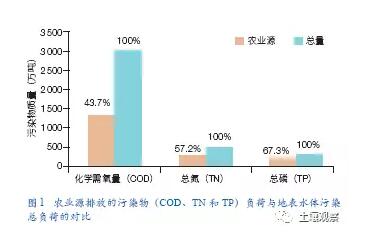 面源污染按照來(lái)源的不同,可細(xì)化為農(nóng)業(yè)面源污染和城市面源污染。隨著城市污水收集管道和雨污分流工程的建設(shè),城市面源污染正逐步得到解決。相對(duì)城市地區(qū),農(nóng)業(yè)面源污染不但多年來(lái)一直是我國(guó)“三河三湖”污染的主要污染源,也漸成為農(nóng)村地表水體污染的主要貢獻(xiàn)者,嚴(yán)重威脅全國(guó)人民的飲水安全。據(jù)2010年《第一次全國(guó)污染源普查公報(bào)》結(jié)果顯示,農(nóng)業(yè)污染源是造成我國(guó)水環(huán)境污染的“大戶”,其化學(xué)需氧量(COD)、總氮(TN)和總磷(TP)排放分別占地表水體污染總負(fù)荷的43.7%、57.2% 和67.4%(圖1)。可見(jiàn),農(nóng)業(yè)面源污染已經(jīng)成為當(dāng)前地表水體污染的主要來(lái)源。全球每年用于糧食生產(chǎn)的1.2億噸氮中,只有 10%被人類直接消費(fèi),大部分未使用的氮?jiǎng)t被分散到廣泛的環(huán)境中,最終匯入地表水體,成為主要的面源污染源。農(nóng)業(yè)則是導(dǎo)致過(guò)量養(yǎng)分排放到水體中的最主要驅(qū)動(dòng)因素。研究表明,太湖約 58%和40% 比例的總氮和總磷來(lái)自于農(nóng)業(yè)產(chǎn)生的面源污染。