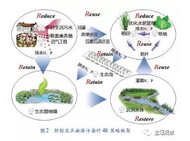 因此,我國(guó)農(nóng)業(yè)面源污染控制須走大區(qū)域聯(lián)控之路,即不僅要集成度高,而且從點(diǎn)到面、從線性到空間的全過(guò)程、全區(qū)域的覆蓋?!笆濉敝痢笆濉逼陂g,基于區(qū)域污染物聯(lián)控思路,我國(guó)已形成了“源頭減量(Reduce)—過(guò)程阻斷(Retain)—養(yǎng)分再利用(Reuse)—生態(tài)修復(fù)(Restore)”的4R策略。迄今為止,針對(duì)上述各農(nóng)業(yè)面源污染防控四個(gè)過(guò)程的技術(shù)研究頗多,技術(shù)儲(chǔ)備也相當(dāng)豐厚,相應(yīng)的工程運(yùn)行也取得一定成效。
