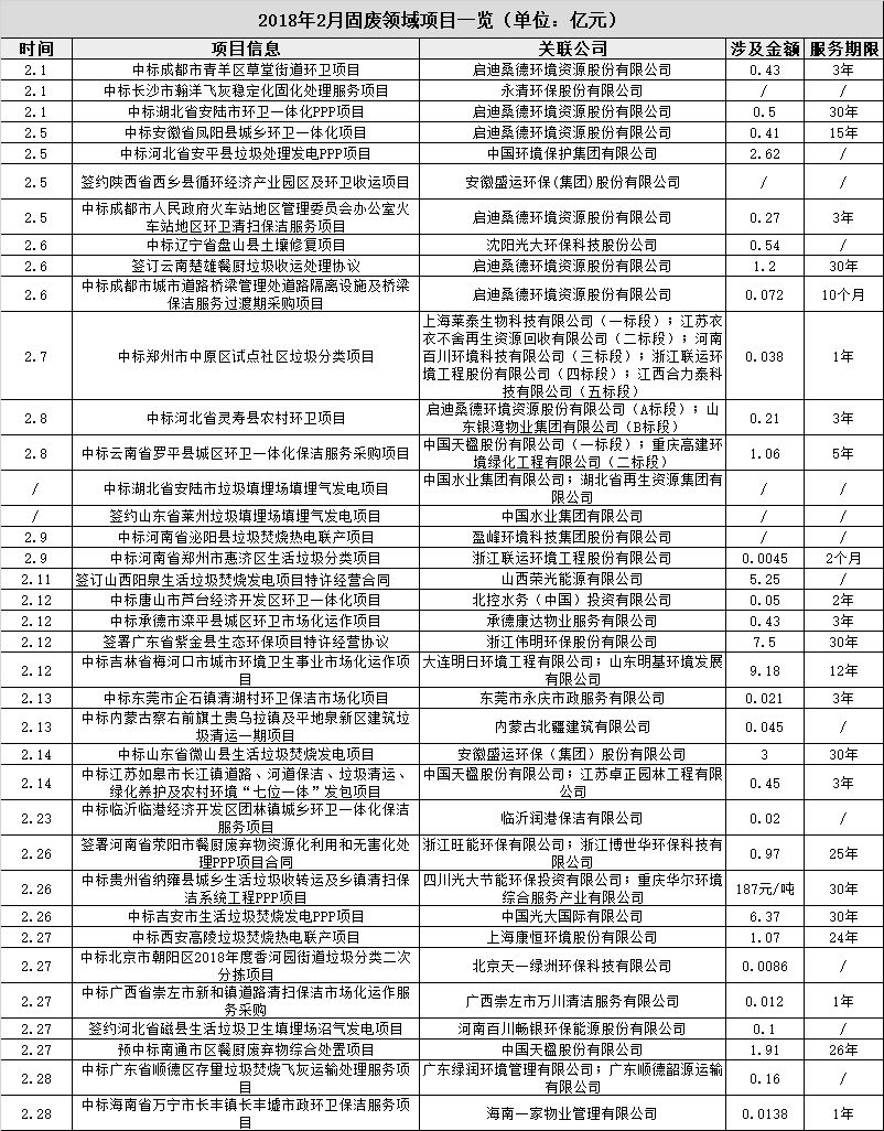 繼2017年11月拿下5固廢項目、12月拿下8固廢項目、2018年1月拿下6項目,啟迪桑德三次成為當(dāng)月拿單王后,2018年2月,啟迪桑德持續(xù)發(fā)力,捷報不斷,拿下7個固廢項目,再次成為拿單王。值得一提的是,7項目包括6個環(huán)衛(wèi)領(lǐng)域項目和1個餐廚垃圾處理項目。