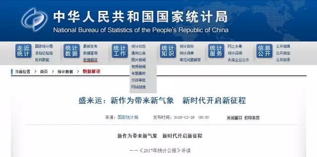 剛剛過去的2017年,是我國經(jīng)濟(jì)社會(huì)發(fā)展進(jìn)程中具有里程碑意義的一年。這一年,我們黨勝利召開了十九大,確立了習(xí)近平新時(shí)代中國特色社會(huì)主義思想的歷史地位,指明了我國發(fā)展新的歷史方位,制定了堅(jiān)持和發(fā)展中國特色社會(huì)主義的行動(dòng)綱領(lǐng)。這一年,在以習(xí)近平同志為核心的黨中央堅(jiān)強(qiáng)領(lǐng)導(dǎo)下,各地區(qū)各部門認(rèn)真貫徹落實(shí)新理念新思想新戰(zhàn)略,堅(jiān)持穩(wěn)中求進(jìn)工作總基調(diào),堅(jiān)持以提高發(fā)展質(zhì)量效益為中心,堅(jiān)持以供給側(cè)結(jié)構(gòu)性改革為主線,砥礪奮進(jìn),攻堅(jiān)克難,經(jīng)濟(jì)運(yùn)行穩(wěn)中向好,好于預(yù)期,經(jīng)濟(jì)社會(huì)發(fā)展主要預(yù)期目標(biāo)全面實(shí)現(xiàn),開啟了高質(zhì)量發(fā)展時(shí)代新征程?!?017年國民經(jīng)濟(jì)和社會(huì)發(fā)展統(tǒng)計(jì)公報(bào)》如期發(fā)表,筆筆數(shù)據(jù)記錄了全國各族人民拼搏奮進(jìn)的累累碩果,張張圖表展示了黨的十八大以來我國發(fā)展取得的歷史性成就、發(fā)生的歷史性變革。為幫助讀者更好地理解公報(bào)的豐富內(nèi)涵,我就過去一年我國經(jīng)濟(jì)社會(huì)發(fā)展情況談一些認(rèn)識(shí)和體會(huì),與大家分享。