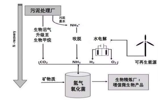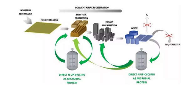 2015年5月,IWA厭氧專家組成員、比利時根特大學的Willy Verstraete教授和他的學生Silvio Matassa在期刊《環(huán)境科學與工程(ES&T)》發(fā)表了題為“Can direct conversion of used nitrogen to new feed andprotein help feed the world?”的文章,提出了一種新的轉(zhuǎn)化路徑——能量到蛋白質(zhì)(power-to-protein)。其本質(zhì)是直接將污水中的氨氮轉(zhuǎn)化成微生物蛋白質(zhì),跳過氮氣轉(zhuǎn)化這一步,形成一個抄近路的氮循環(huán)的升級模式。這是一種可持續(xù)的蛋白質(zhì)生產(chǎn)方式,它比傳統(tǒng)經(jīng)典方法耗能更少,并且將“廢物”轉(zhuǎn)化為高附加值的產(chǎn)品。