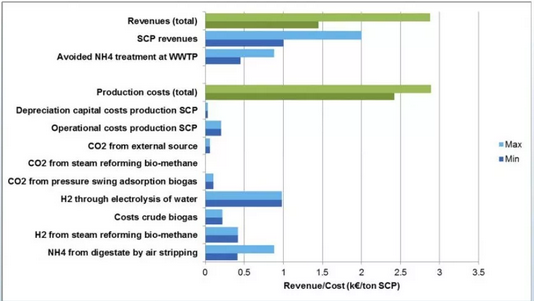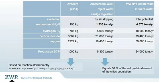 分析結(jié)果顯示污水中蘊含的單細胞蛋白SCP產(chǎn)量潛力是相當可觀的:阿姆斯特丹西區(qū)污水廠一年的污泥消化液能產(chǎn)生6300噸SCP,能滿足城市人口36%的凈蛋白需求。在經(jīng)濟層面而言,SCP也有可觀的價值。關(guān)鍵是找出從污水中高效提取氨的方法。另外研究團隊還對蛋白的營養(yǎng)價值、可消化性、變應(yīng)原性以及公眾接受度進行了初步評估。