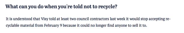 Visy稱中國的禁令是此舉的理由。面對媒體,Visy 拒絕采訪,Wheelie Waste 也沒有對此事件做任何評論。