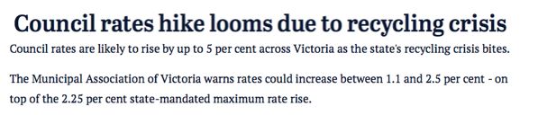 據(jù)《The Age》報道,維州垃圾回收危機(jī)將造成市政費上漲高達(dá)5%。市政費是市政廳對管轄區(qū)內(nèi)所有業(yè)主(包括居民和企業(yè))征收的費用,其中有一部分會用于當(dāng)?shù)氐睦幚怼?/p>