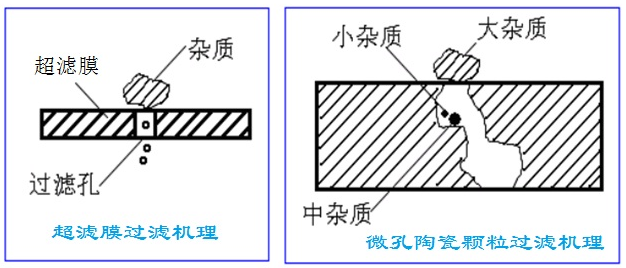 這是過(guò)濾截留原理示意圖,左圖表示超濾由固定孔徑機(jī)械截留,截留的雜質(zhì)在表面堆積,小于孔徑的雜質(zhì)會(huì)透過(guò)膜,液體的過(guò)濾路徑只有0.1微米。過(guò)濾精度越高則孔徑越小,但是推動(dòng)力也越大,而節(jié)能微濾的過(guò)濾路徑是超濾路徑的數(shù)千倍,更多的截留雜質(zhì)不僅僅是在表面,而是在濾層和微孔之中,深長(zhǎng)的過(guò)濾路徑彎彎曲曲,路徑的寬度忽大忽小,同時(shí)由于對(duì)顆粒表面的改性處理,不同的改性表面能夠?qū)Σ煌碾s質(zhì)具有吸附作用,從而使得較小的雜質(zhì)難以穿透濾層,初期截留的雜質(zhì)進(jìn)一步增加了濾料的表面積,從而可以截留更多更小的雜質(zhì),稱(chēng)之為以渣濾渣。