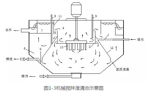 機械攪拌澄清池是一種泥渣循環(huán)型澄清池,池體由第一反應(yīng)室、第二反應(yīng)室和分離室三部分組成,見圖1-3。